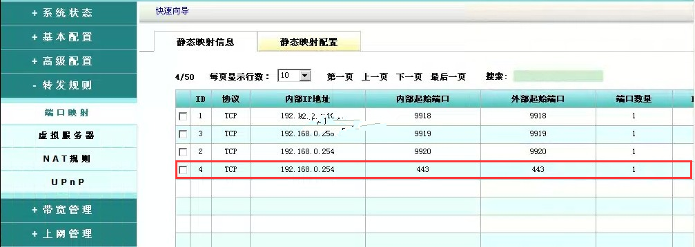 3、 进一步查看网吧路由器,发现网吧Pubwin服务端的443端口被映射到互联网。