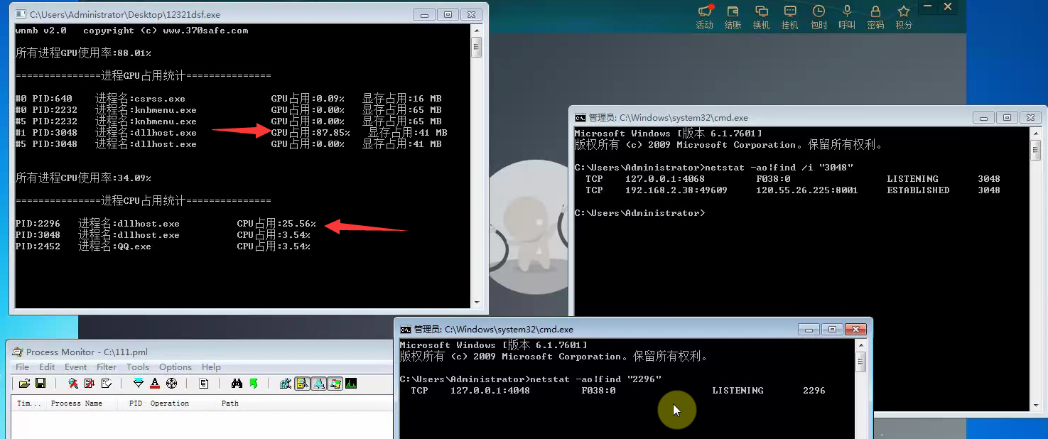 4、 准备打开调试工具查看dllhost程序网络连接,发现打开调试工具或者GPU检测工具或者任务管理器后程序自动消失。