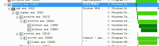 8、将机器反复重启多次开机执行ProcessMonitor后抓到完整启动过程,证明Loader.exe是被一个Ghostlu.exe的程序(PID是1944)所运行创建起来。
