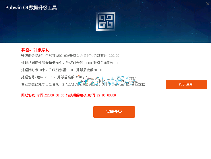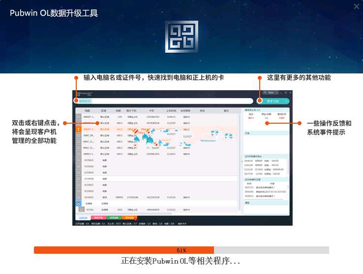 升级注意事项: 1.备份Pubwin2015数据库文件database 2.控制台先交接班 3.正在上机的用户不需要下机 4.服务器IE版本需要升级到IE8以上。 正式升级 1. 到PuwbinOL官网(http://download.pubwinol.com)下载PubwinOL升级工具 2. 下载完成以后在Pubwin服务器运行(建议升级之前先备份database)如图: