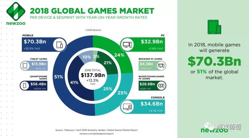 在2018年,主机游戏、PC游戏收入占全球游戏市场总收入的比例分别为25%和24%。
