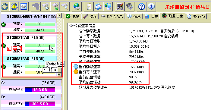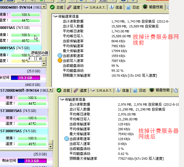 【问题分析】 1:服务端系统虚拟盘缓存命中率92.77,排除因缓存设置过小而导致镜像盘压力大,客户机读取数据慢的情况。 2:客户机2G-4G,缓存设置自动分配,开机不到30台就出现此情况,回写盘数量有两块80G,排除因回写数量或客户机缓存设置小导致的回写盘压力大。 3:系统虚拟盘已经是最新的2100版本,不存在个别主板兼容性问题。 收集以上环境现象后继续向下排查,通过工具仔细观察回写盘数据流量的时候发现每块回写盘都会有每秒7-8M的回写量,磁盘活动99%,如下图: